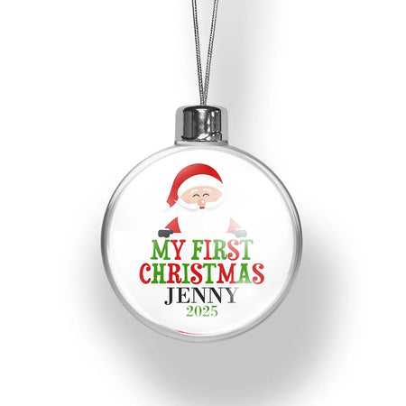 Crafted from clear acrylic and featuring a screw-on cap with a silver string, your custom design is printed on both sides and enclosed within the transparent Christmas ball, arriving ready to hang on your tree.